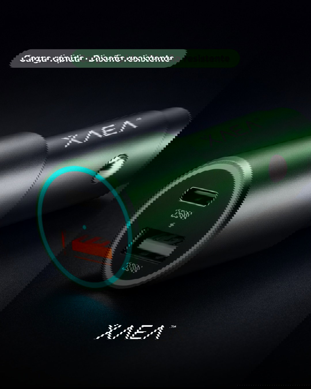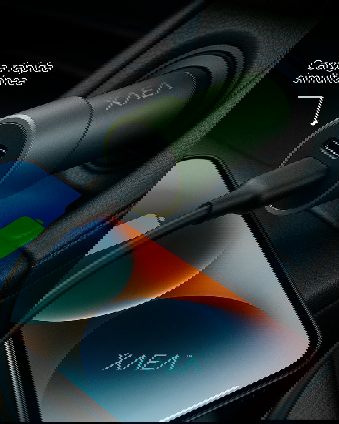 El Cargador Auto Voltair de XAEA integra USB + Tipo C con Power Delivery, permitiendo carga simultánea para dos dispositivos y compatibilidad con vehículos de 12–24V.