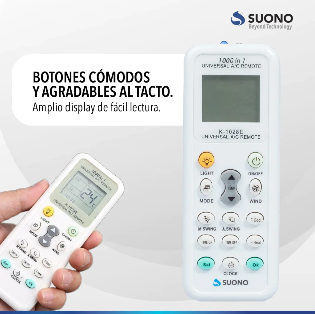 Control remoto universal compatible con la mayoría de los equipos de aire acondicionado del mercado. Permite reemplazar controles originales perdidos o dañados y ofrece una configuración rápida y sencilla, tanto automática como manual.