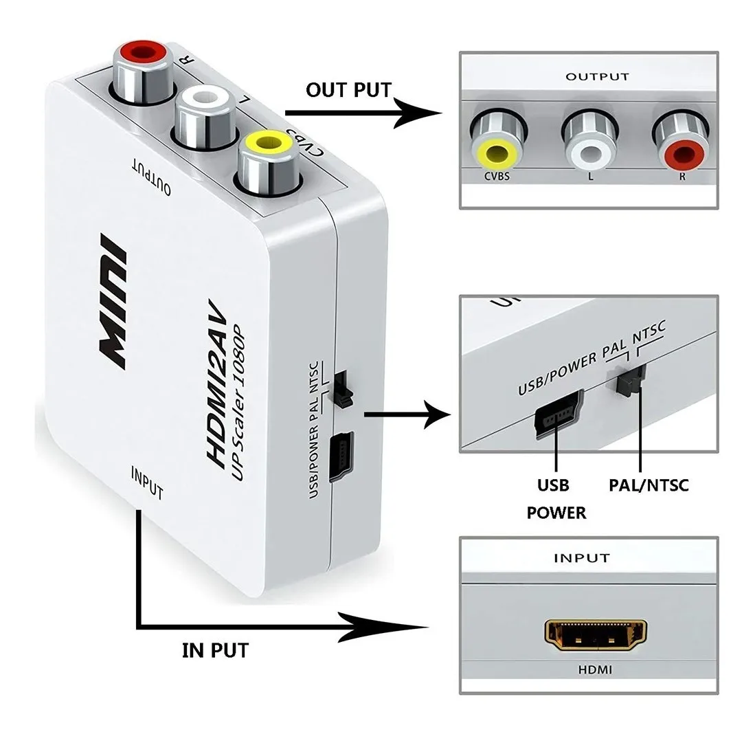 El adaptador incluye un cable de alimentación USB de 5V, asegurando un funcionamiento óptimo. Con un solo puerto HDMI y conectores RCA de audio y video compuesto, es la solución perfecta para revivir tus dispositivos más antiguos y disfrutar de tus películas, series y juegos sin complicaciones.