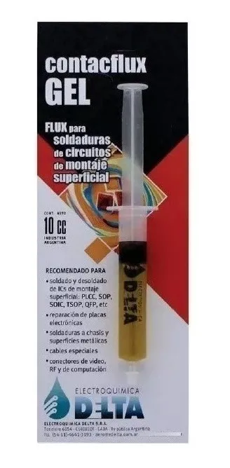 Flux para soldaduras de circuitos de montaje superficial. Su presentación en jeringa permite una aplicación puntual en circuitos integrados de dimensiones reducidas. Evita la oxidación de las pitas de cobre en circuitos impresos y permite obtener soldaduras brillantes y confiables. Durante el soldado, disminuye la tension superficial del estaño y la temperatura de fusion, evitando el deterioro de componentes, trazas y terminales.