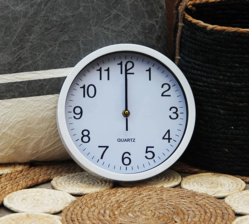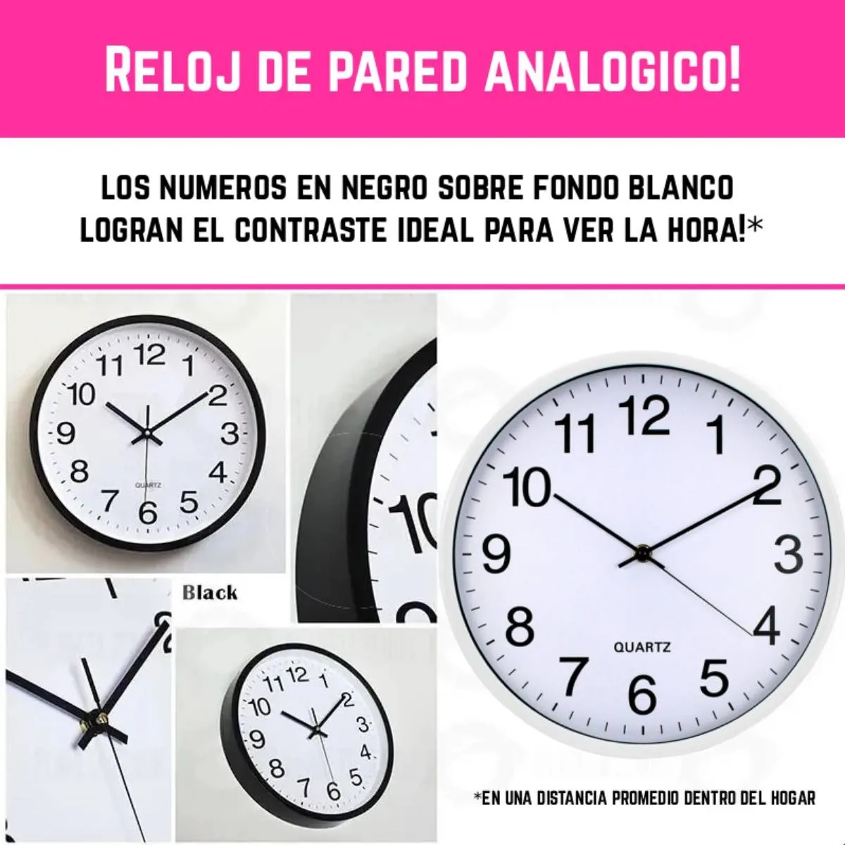 Reloj de pared minimalista, muy clasico, es silencioso, con aguja continua. Estampa blanca y con marco color negro, marca la hora, minuto y segundo.